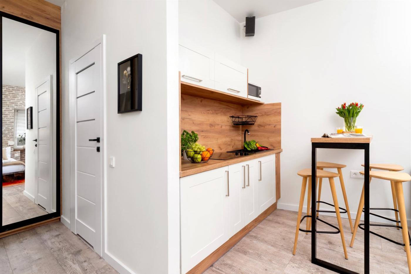 Apartament. The apartment has 1 bedroom and 1 bathroom with a walk-in shower and free toiletries. Meals can be prepared in the well-fitted kitchenette, which features a stovetop, a refrigerator, kitchenware and a microwave. This apartment features a washing machine, a tea and coffee maker, flat-screen TV with streaming services, as well as fruit for guests. The unit has 2 beds. Apartament - 4 osobowy. Powierzchnia pokoju ok.: 25 mkw.