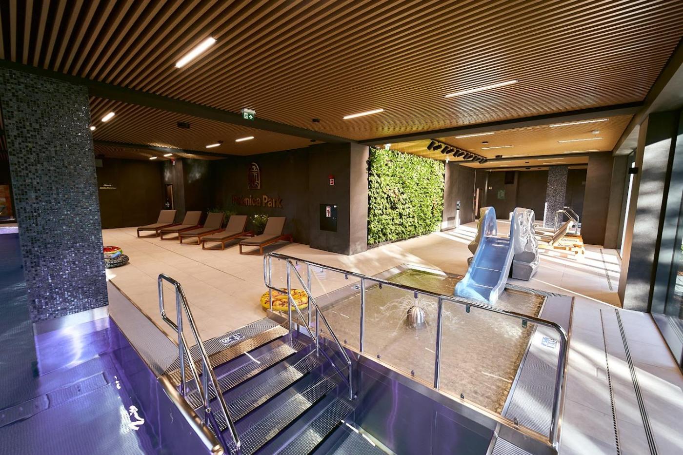 Zaplecze odnowy biologicznej obiektu Polanica Park - LAGUNA - PREMIUM 3 -BURGUNDOWY obejmuje kryty basen, saunę i wannę z hydromasażem.