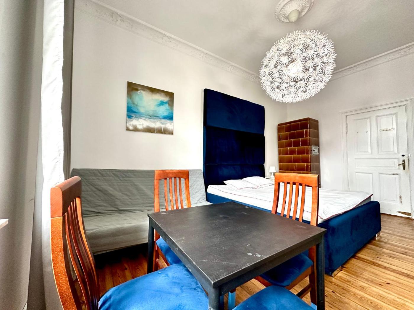Pokój Dwuosobowy typu Standard ze wspólną łazienką. The double room offers parquet floors, heating, as well as a shared bathroom boasting a shower. The double room features a flat-screen TV, a dining area, a wardrobe, an electric kettle as well as city views. The unit has 1 bed. Pokój Dwuosobowy - 2 osobowy. Powierzchnia pokoju ok.: 10 mkw.