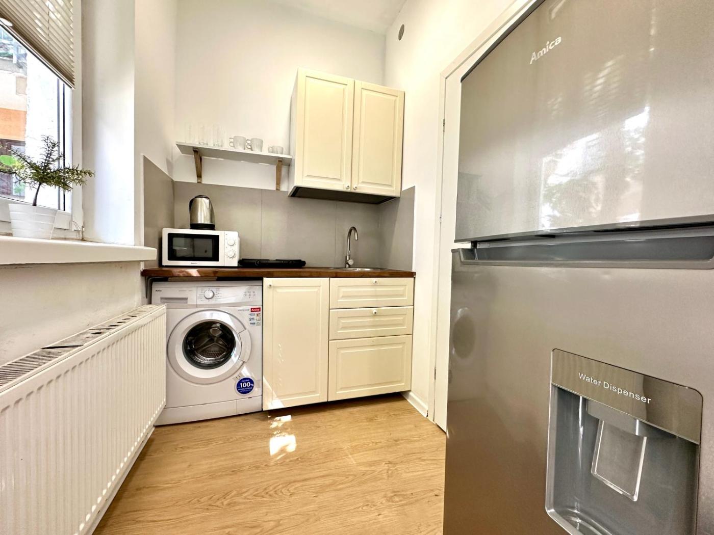 Studio. In the kitchen, guests will find a stovetop, a refrigerator, kitchenware and an electric kettle. The studio offers a washing machine and a dining area, as well as a private bathroom boasting a shower. The unit has 1 bed. Studio - 2 osobowy. Powierzchnia pokoju ok.: 20 mkw.
