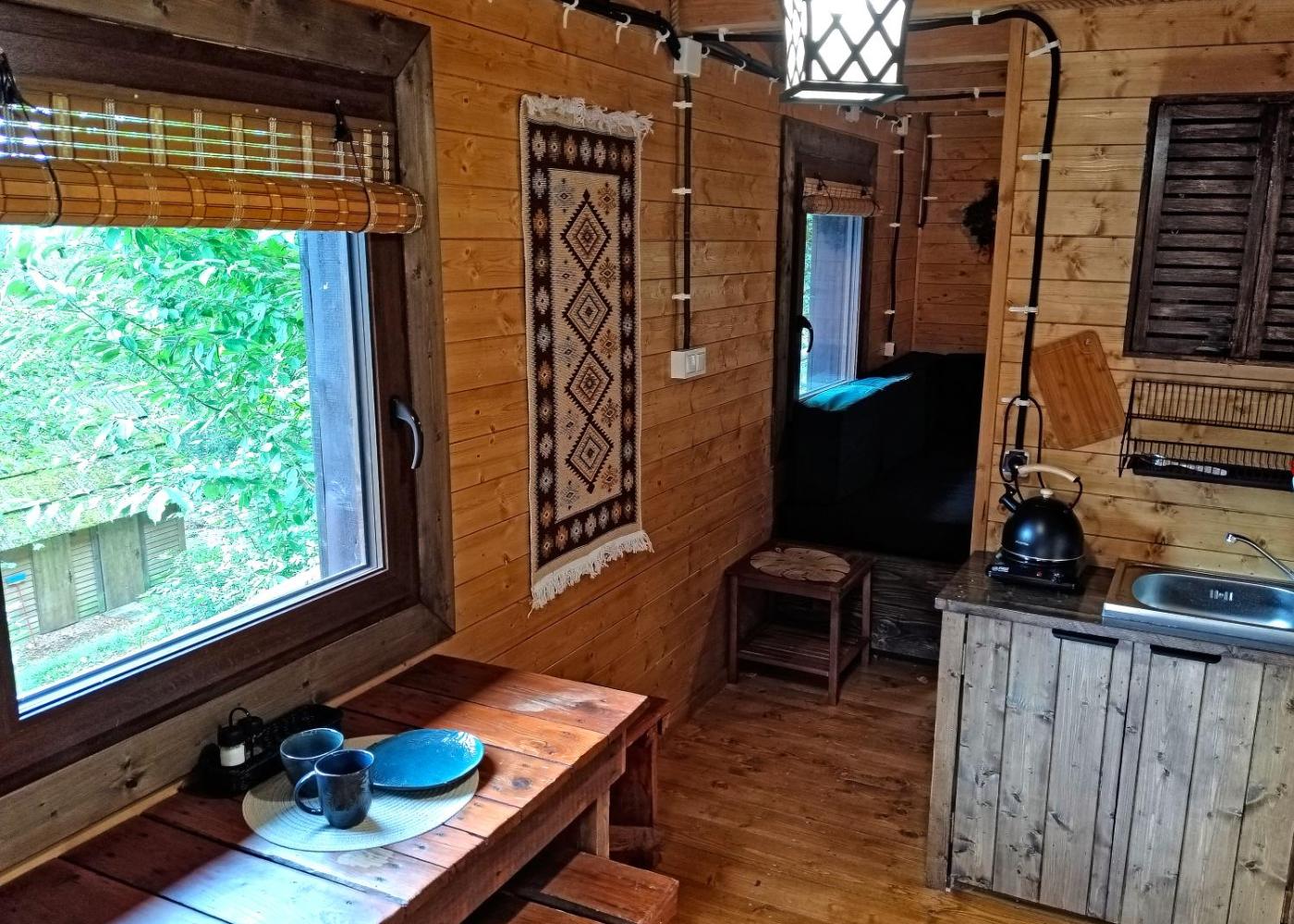 Domek z 1 sypialnią. Boasting a private entrance, this chalet comes with 1 living room, 1 separate bedroom and 1 bathroom with a shower. Guests will find a stovetop in the kitchenette. The chalet also includes a barbecue. The chalet has parquet floors, a seating area, a dining area, an electric kettle as well as garden views. The unit has 2 beds and 5 futons. Domek - 6 osobowy. Powierzchnia pokoju ok.: 20 mkw. ;