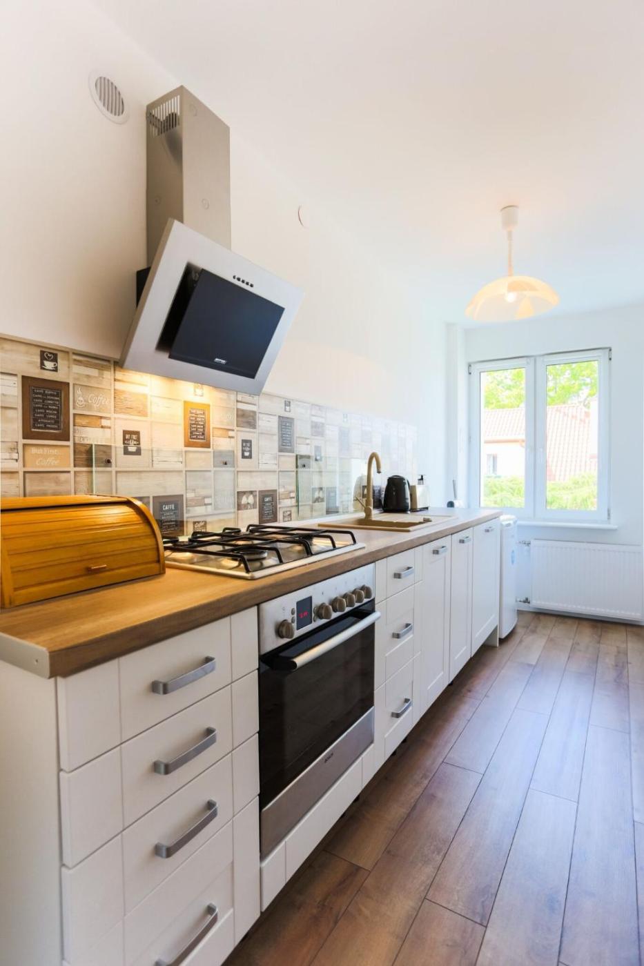 Apartament z 1 sypialnią. This apartment consists of 1 living room, 1 separate bedroom and 1 bathroom with a bath and a hairdryer. Guests can make meals in the kitchen that is equipped with a stovetop, a refrigerator, kitchenware and an oven. The apartment provides a coffee machine, a wardrobe, heating, as well as a flat-screen TV with cable channels. The unit offers 2 beds. Powierzchnia pokoju ok.: 42 mkw.