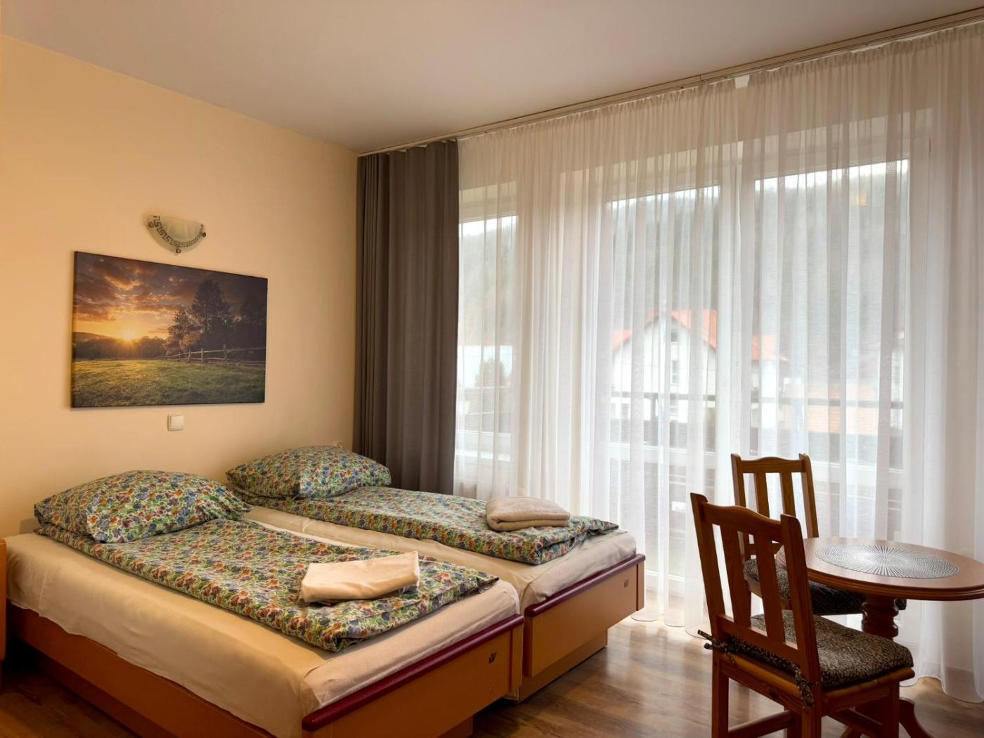 Pokój trzyosobowy z balkonem. Ten pokój trzyosobowy jest wyposażony w szafę oraz czajnik elektryczny i dysponuje balkonem z widokiem na góry oraz łazienką z prysznicem. W opcji zakwaterowania znajdują się 2 łóżka. Pokój Trzyosobowy - 4 osobowy. Powierzchnia pokoju ok.: 15 mkw. ;