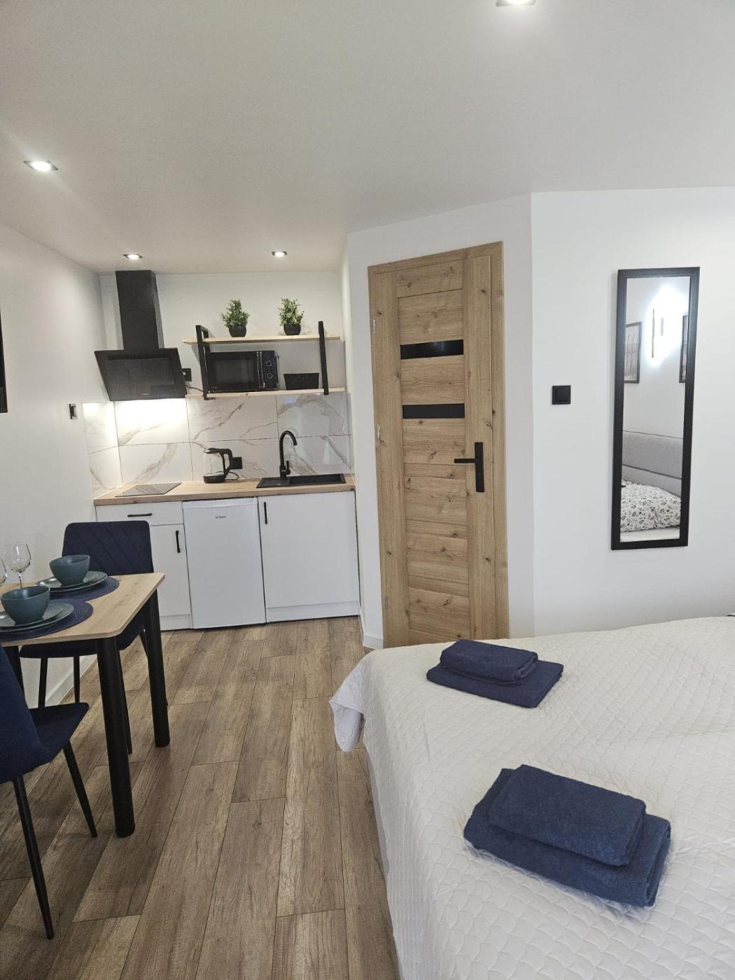 Studio typu Deluxe z łóżkiem typu king-size. The well-equipped kitchenette features a stovetop, a refrigerator, kitchenware and a microwave. The studio provides a private entrance, a dining area, a terrace with garden views as well as a private bathroom featuring a shower. The unit offers 1 bed. Studio - 2 osobowy. Powierzchnia pokoju ok.: 18 mkw.
